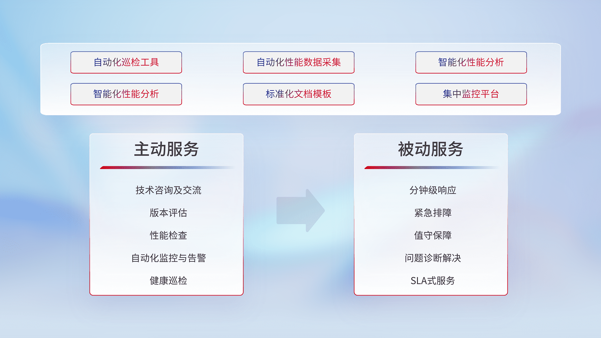 智能化工具和标准化文档,,保障服务质量,,提供主动服务(包含技术咨询、、、、版本评估、、、性能检查、、、自动化监控与告警、、、健康巡检)和被动服务包含(分钟级响应、、、紧急排障、、值守保障、、问题诊断解决、、、、SLA服务)。。